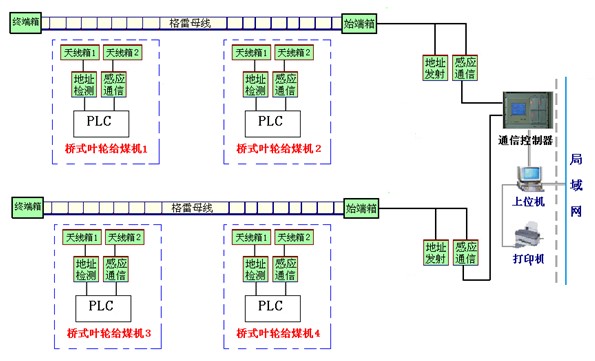 每臺車設置一臺感應通信裝置,感應通信裝置通過485總線與車上PLC相連,用于解決葉輪給煤機與地面站的數(shù)據(jù)交換和聯(lián)鎖操作。。
