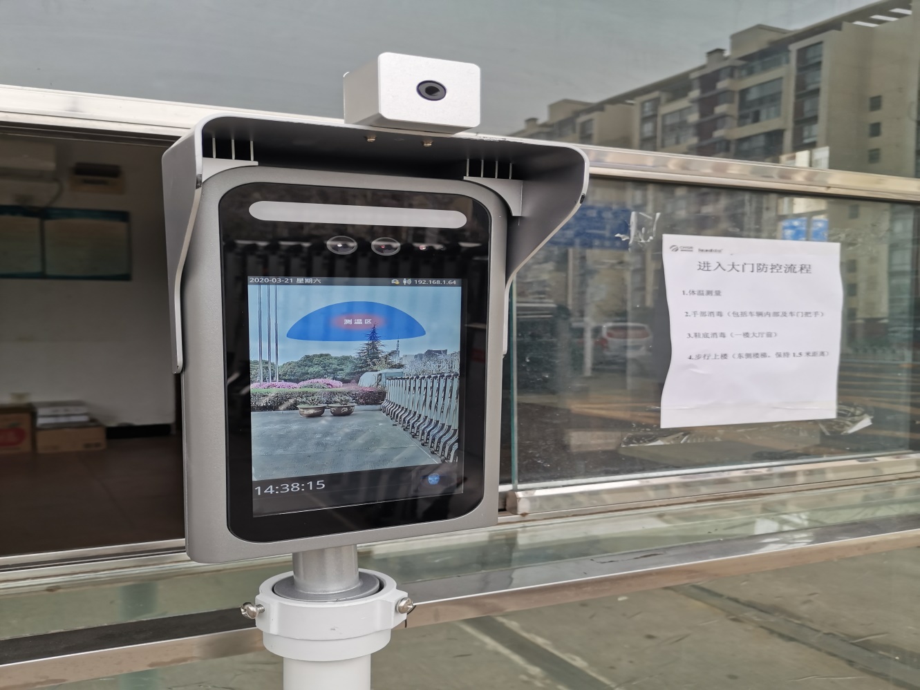 圖為總部贈(zèng)與武漢利德的人臉識(shí)別智能測(cè)溫儀-放于大門入口處,高效率智能識(shí)別人臉和體溫并有效的防止了接觸和二次交叉感染,為防控病毒做好了第一道有力防線。